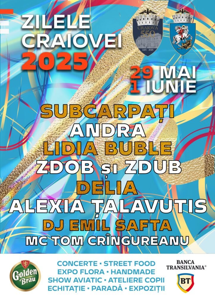 Craiova sărbătorește 550 de ani de la prima atestare documentară, cu patru zile de evenimente, pline de surprize memorabile, alături de cei mai în vogă artiști ai momentului: Andra, Delia, Zdob și Zdub, Subcarpați și Lidia Buble!